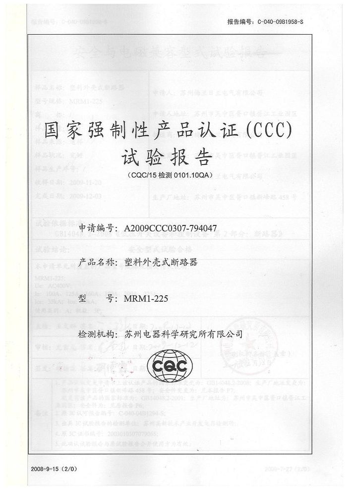 MRM1-225塑殼斷路器資質(zhì)證書(shū)