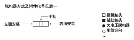 附件裝置分內(nèi)部裝置和外部裝置:內(nèi)部裝置有分勵脫扣器、欠電壓脫扣器、輔助觸頭、