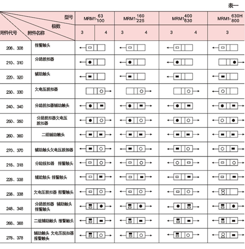 對MRMl-400、MRMl-630及MRMl-800其中248、348、278、378規(guī)格中輔助觸頭為一對觸頭(即一常開、一常閉),268、368規(guī)格中的輔助頭為三對觸頭