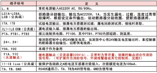 ILIA. ILIB | 漏電輸入端,接零序互感器的輸出端。 RS485通訊口,TA、TB為485信號(hào)線,GND為信號(hào)地 |