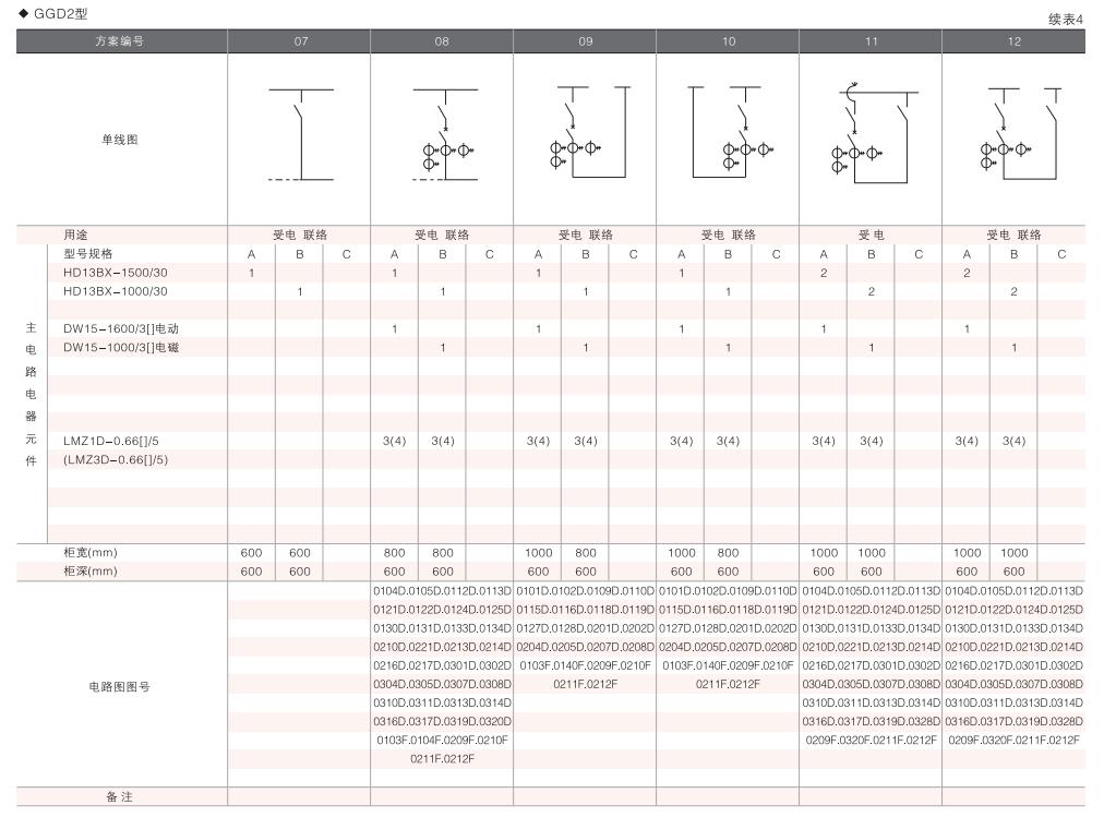 此外,為適應無功補償?shù)男枰O計了GGD電容補償柜,其主電路方案4個,共12個規(guī)格。